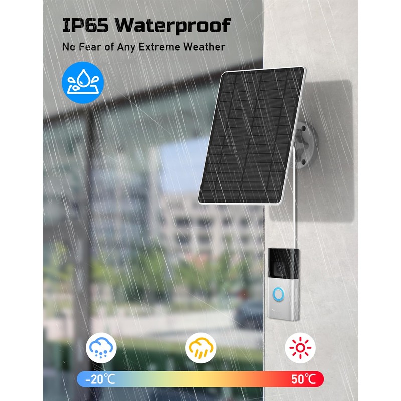 - 【Standing Up to Extreme Weather】Our ring doorbell solar panel has an IP65 waterproof rating and can easily withstand extreme weather conditions such as heavy rain or heavy snow. With a working temperature range from -5°F to 120°F, it is highly durable.