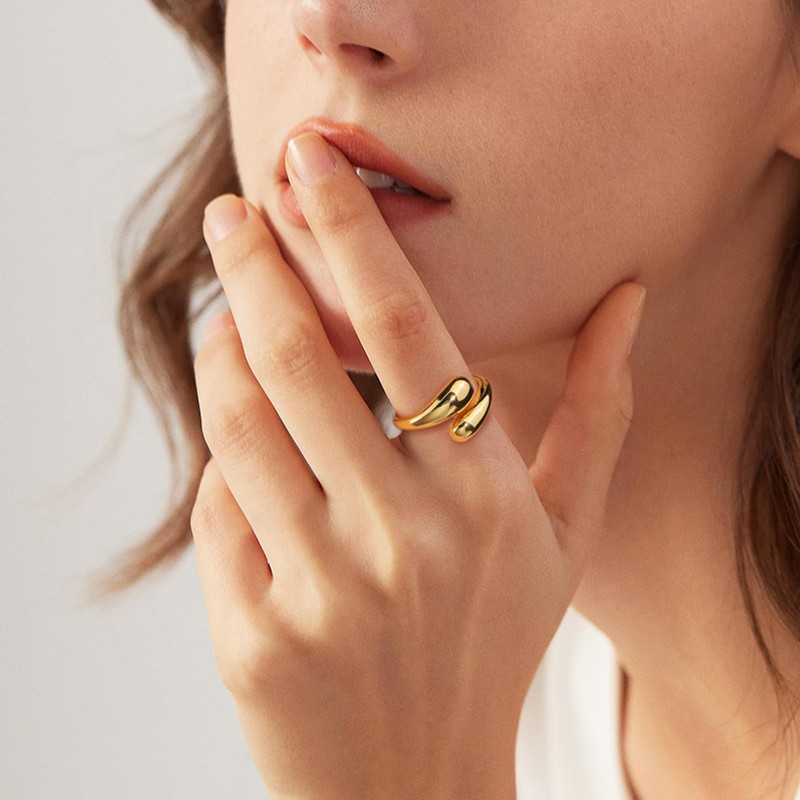 Rings for Women, Gold Plated Polished Water Drop Ring, Hypoallergenic 14K Gold Plated Chunky Teardrop Ring, Fashion Adjustable Ring, Sterling Silver, N0