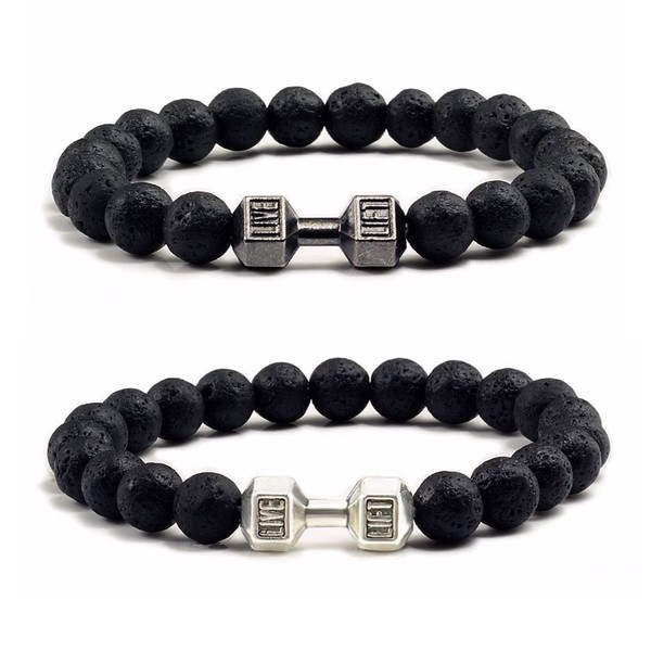 RINHOO FRIENDSHIP 2 PCS Dumbbell Bracelet for Man Gym Bracelet 8mm Lava Natural Stone Stretch Beads Bracelet with Dumbbell Weight Bracelet for Man (Lava Black & Lava Silver)