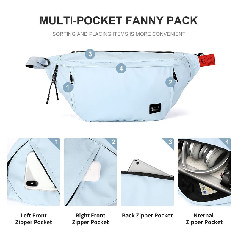 Riñoneras unisex para mujeres y hombres, con conector para auriculares y correa ajustable con cremallera, riñonera negra para exteriores y gimnasio (riñonera), Azul claro (con 5 bolsillos con cremallera), Large