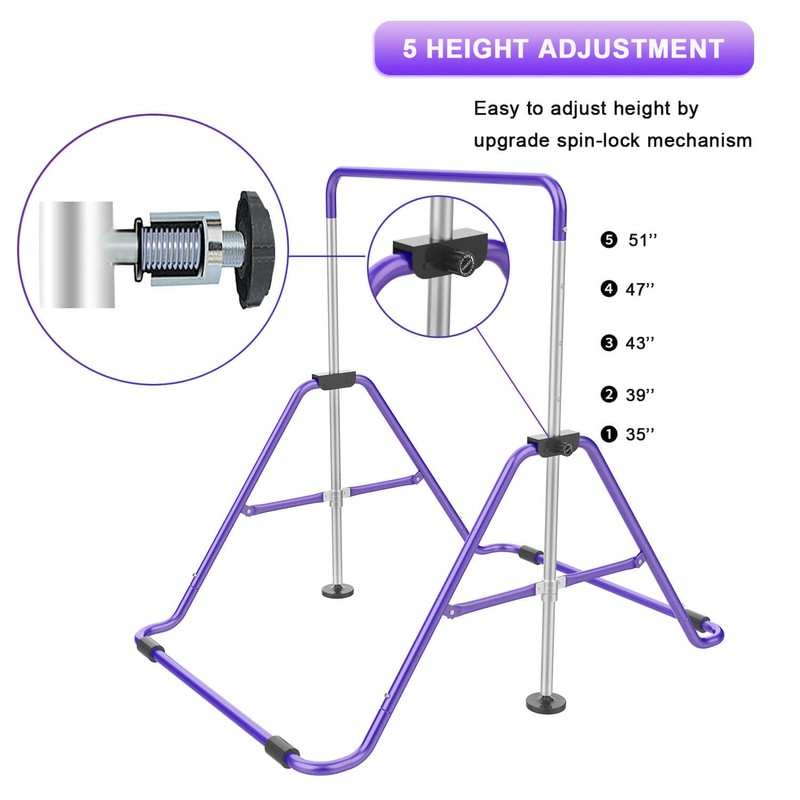 - ? ADJUSTABLE HEIGHT: Your little kid can grow with our gymnastics bar for home because this gymnastic bar is adjustable. You can easily adjust the height of our gymnastic bar to 35'', 39'', 43 '', 47'' and, 51, fits kids between 3-8 years old. RINREA horizontal kip bar can accommodate up to 140lbs.