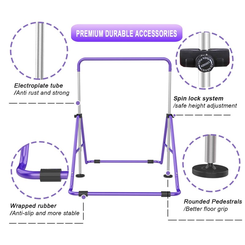 - ? SAFE&STABLE: RINREA Gymnastics bar constructed with thick galvanized steel tube frame that forms sturdy triangular structure. Four rubber rings for home gymnastics bar legs give extra friction. Two rounded pedestals on gymnastics bar support tube helps to find the best balance to the ground by just rotating them. These all make your kids gymnastic bar keep stable and safe, give extreme security to your little kid.