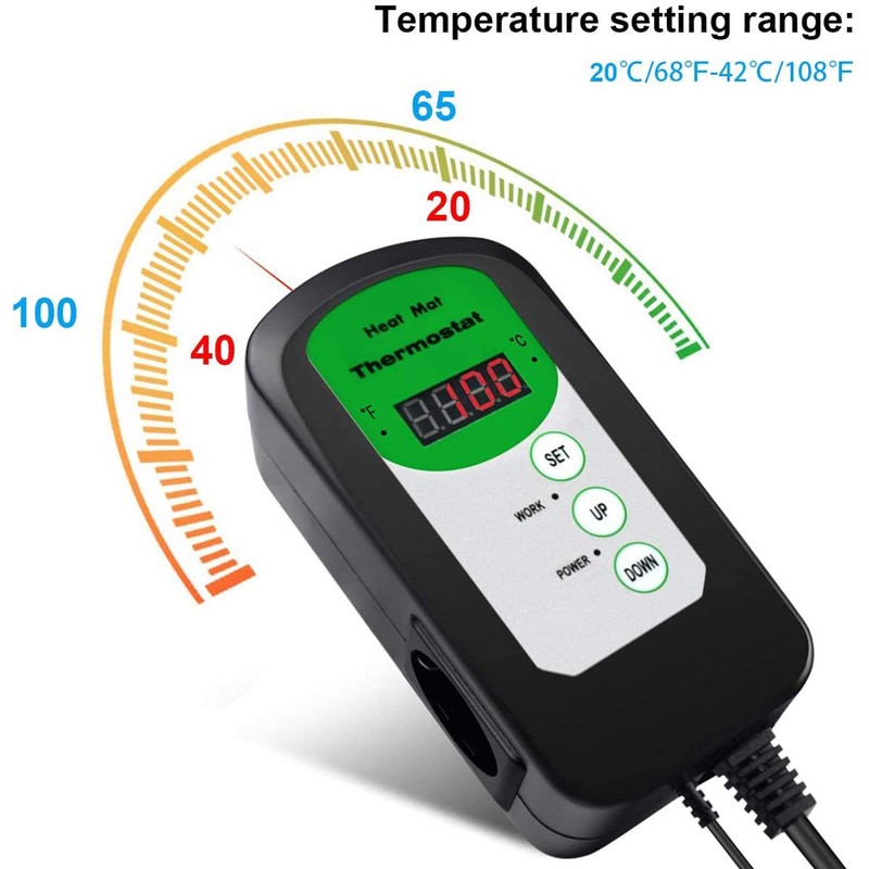 • Temperature control: Our digital thermostat regulator is compatible with almost all seedling heat mats. The thermostat sensor probe delivers accurate readings in both cold and warm environments. Maintains a stable temperature between 68°F / 20°C and 108°F / 42°C for professional use.