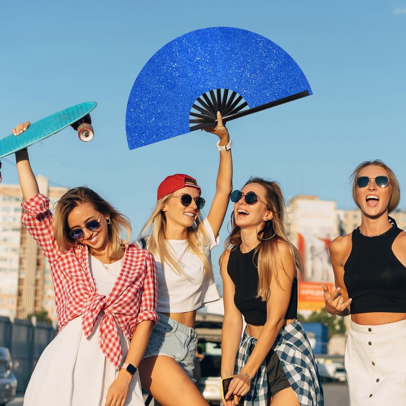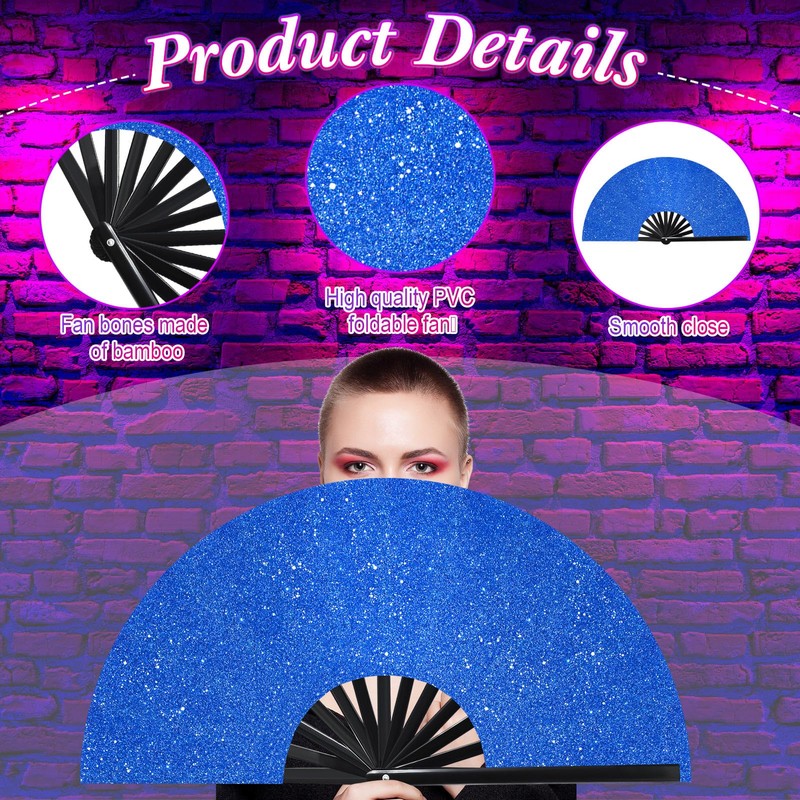 Ripeng 13" Glitter Large Rave Hand Fan Folding Clack Rave Fan for Women with Leg Strap and Fabric Case Bag for Dance, Edm (Royal Blue)