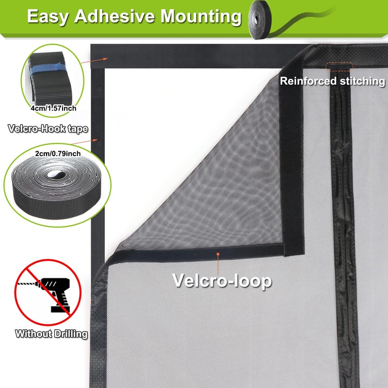 - Easy Adhesive Installation & With Accessories: It is easy and takes only a few minutes to install, no drilling, no damage your door/window frame or walls. Accessories included the hook tape, which can be applied to smooth and flat frames/surfaces (wooden frame, aluminium frame, tile wall, glass wall, etc, except for whitewashed walls), and nails (for secure hanging, to fix the tape on an uneven wooden frame)