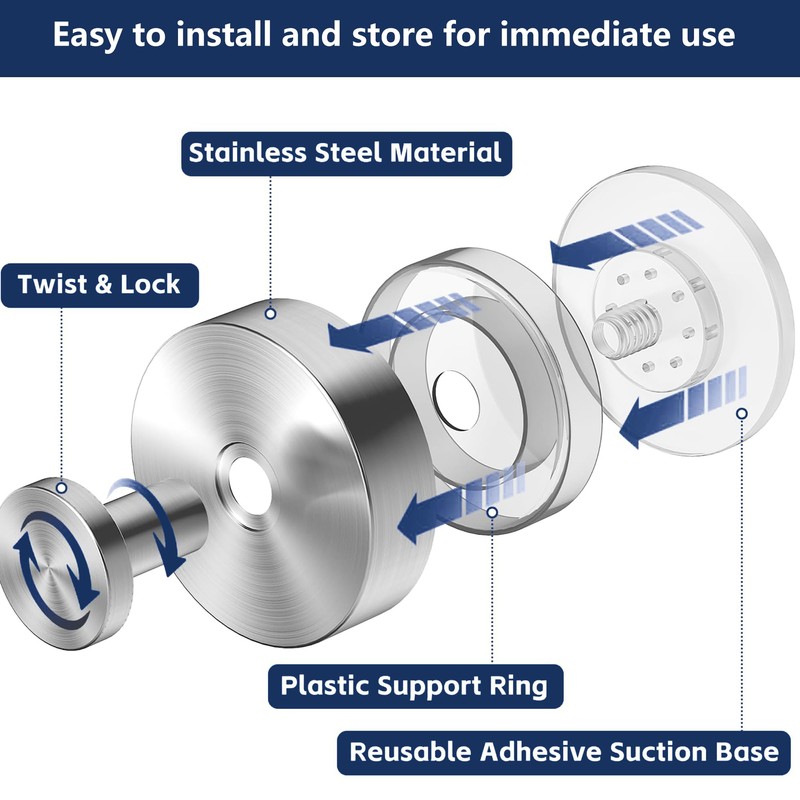 - ✓Easy Installation: 1. Clean smooth surface. 2. Press silicone base firmly. 3. Install the sealing ring and stainless steel cover, twist hook clockwise to tighten – complete setup with no tools.