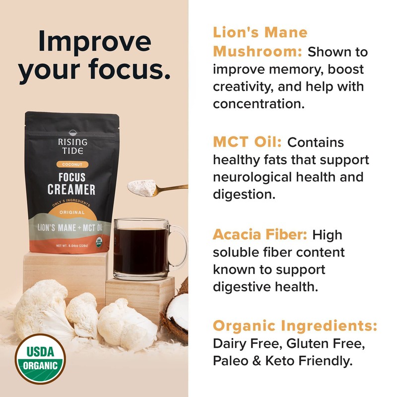 - WHAT IS FOCUS CREAMER?A powerful dairy free coffee creamer that features a blend of brain boosting ingredients including Lions Mane Mushroom and MCT Oil Organic; Improve your focus and achieve more every day with a simple addition to your cup of coffee; This non dairy creamer is a paleo & keto friendly creamer that is vegan and nondairy