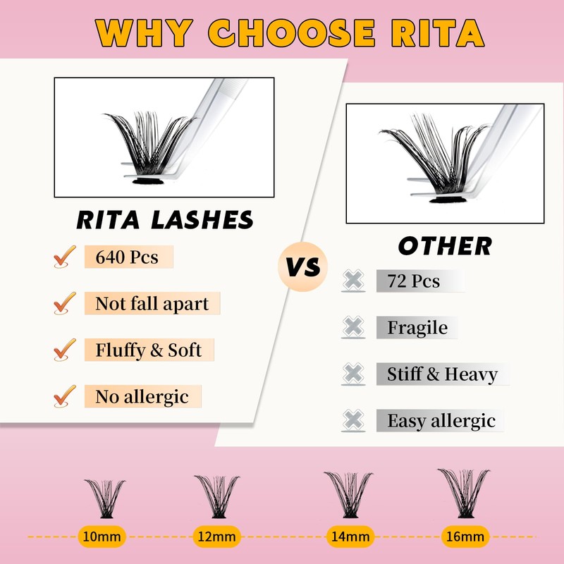 - 640 Pieces Cluster Eyelash Book:RITALASH Cluster Lash is very easy to use and can create any desired eyelash effect. You can change your eyelash look anytime and anywhere. One eyelash tray is enough to use it many times.