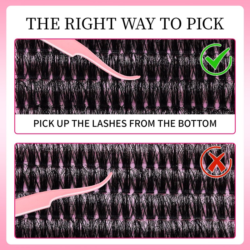 • Suitable to wear: Use a tweezer to pinch the band of cluster eyelashes and apply lash clusters below your natural lashes. You can barely feel the cluster lashes. The bottom of the clusters is flat and hardly noticeable. The lash band part will not stab your eyelid area when you blink. Bring you a perfect experience during lash application.