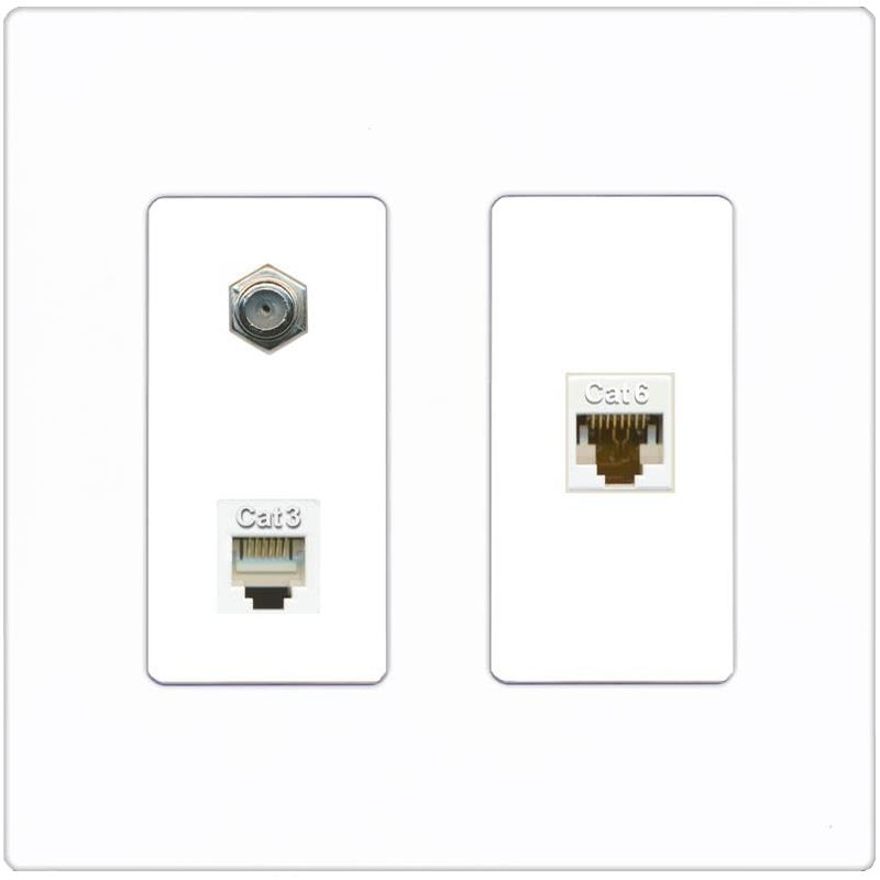 RiteAV 1 Port CAT6 Ethernet Coax Phone Wall Plate - 2 Gang [Screwless White]