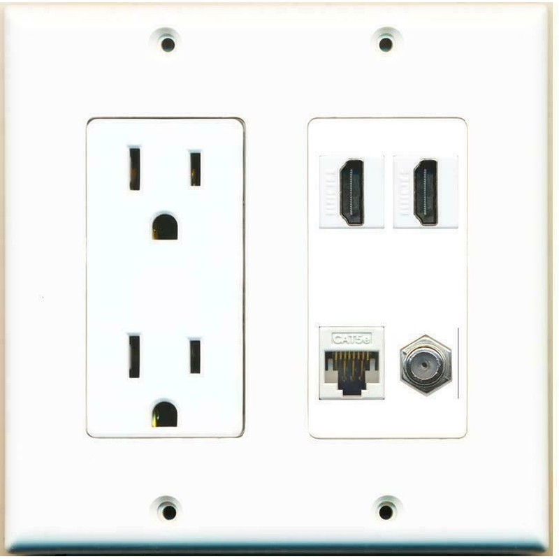 RiteAV [ 2 GANG ] 15 Amp Duplex Power Outlet 2 HDMI CAT5E Coax Cable TV Wall Plate