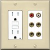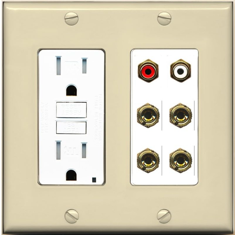 RiteAV 4 Banana (2 Speaker) Binding Post Wall Plate with 2 RCA Jacks (Red+White) - GFCI Outlet [Ivory/White]