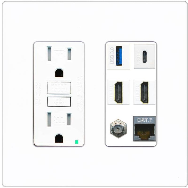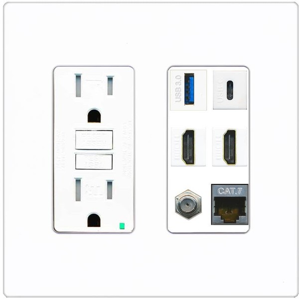 RiteAV USB 3 USB C 2 HDMI Coax Cat7 Wall Plate - GFCI [Screwless White]