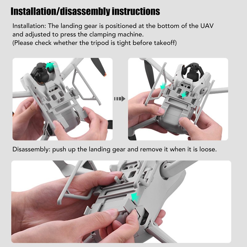 Instalación: tren de aterrizaje alineado con la parte inferior del dron para instalar, ajuste la prensa para apretar la máquina. (Tenga en cuenta que antes del despegue, verifique si el trípode está bien instalado)
