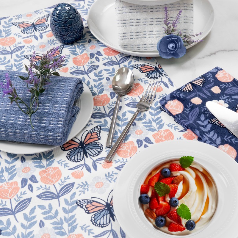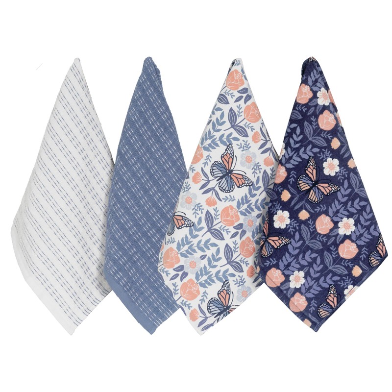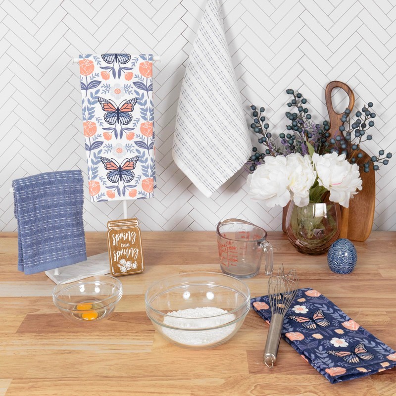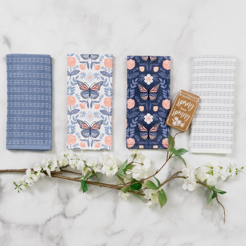 • A FLUTTER OF STYLE FOR YOUR KITCHEN. This 4-piece spring towel set features butterflies and blooms in a mix of designs: 1 dual-sided towel for versatile use, 1 fiber-reactive towel with vibrant prints, and 2 plush woven terry towels for ultimate absorbency.