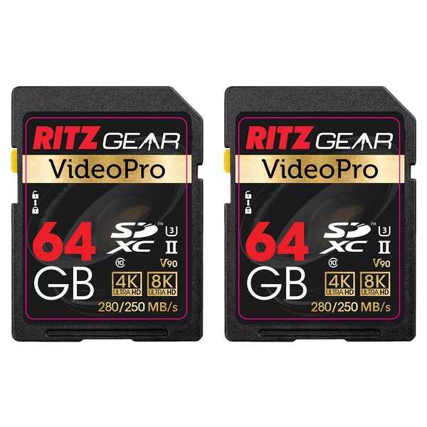 Ritz Gear Video Pro SD Card UHS-II 64GB SDXC Memory Card 2-Pack U3 V90 A1, Extreme Performance Professional (R 280mb/s 250mb/s W) for Advanced DSLR,Well-Suited for Video, Including 4K,8K, 3D, Full HD