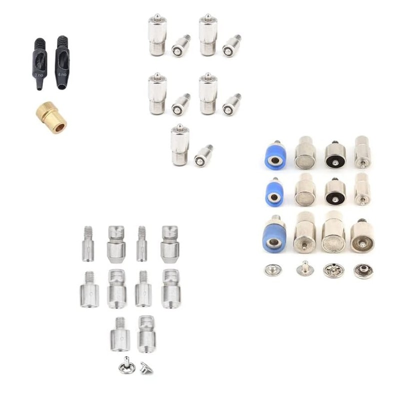- ✔ Includes 3 sets Snap Button Dies, 5 sets Double Cap Rivet Dies, 5 sets Eyelet Grommet Dies and 2 mm, 4 mm hole punchers for press machine.