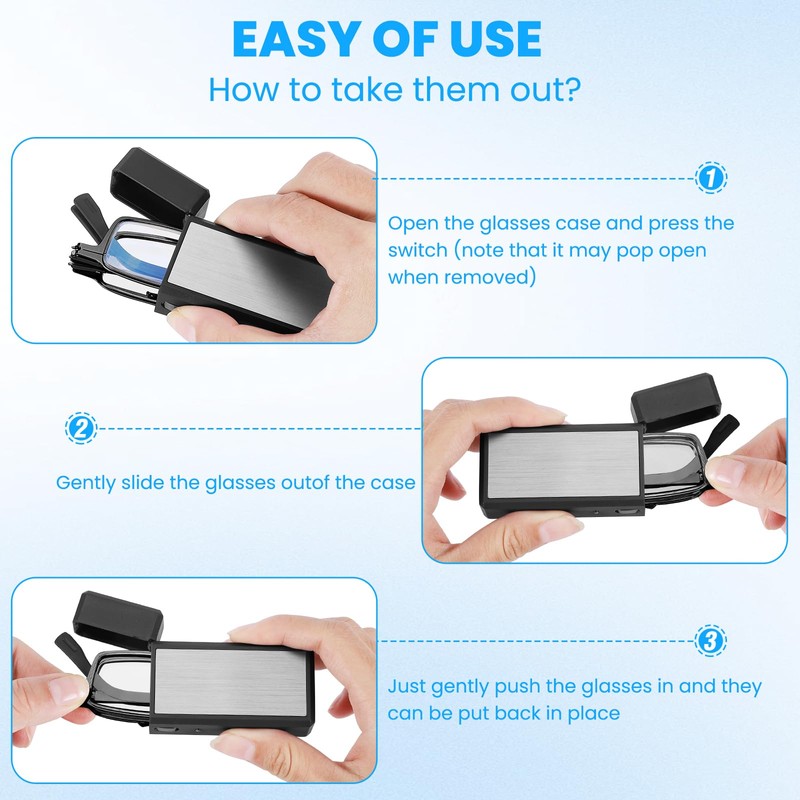 - 【Innovative Eyeglass Case】The blue light blocking glasses is equipped with a unique spring designed glasses case, which can be easily opened and closed with just one press of the switch, making it more convenient for you to access your reading glasses.