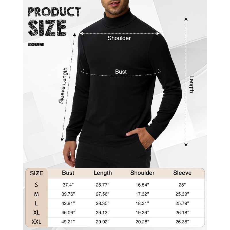 - Size Options and Garment Care: This men's turtle neck long sleeve is available in multiple sizes, from S to XXL, so you can choose the size that suits you. If you like a fitted effect, choose a regular size. If you like a loose effect, choose a larger size. This shirt can be hand-washed or machine-washed and hung to dry. Be careful to wash it separately from dark colors to avoid color transfer. Remember not to bleach it
