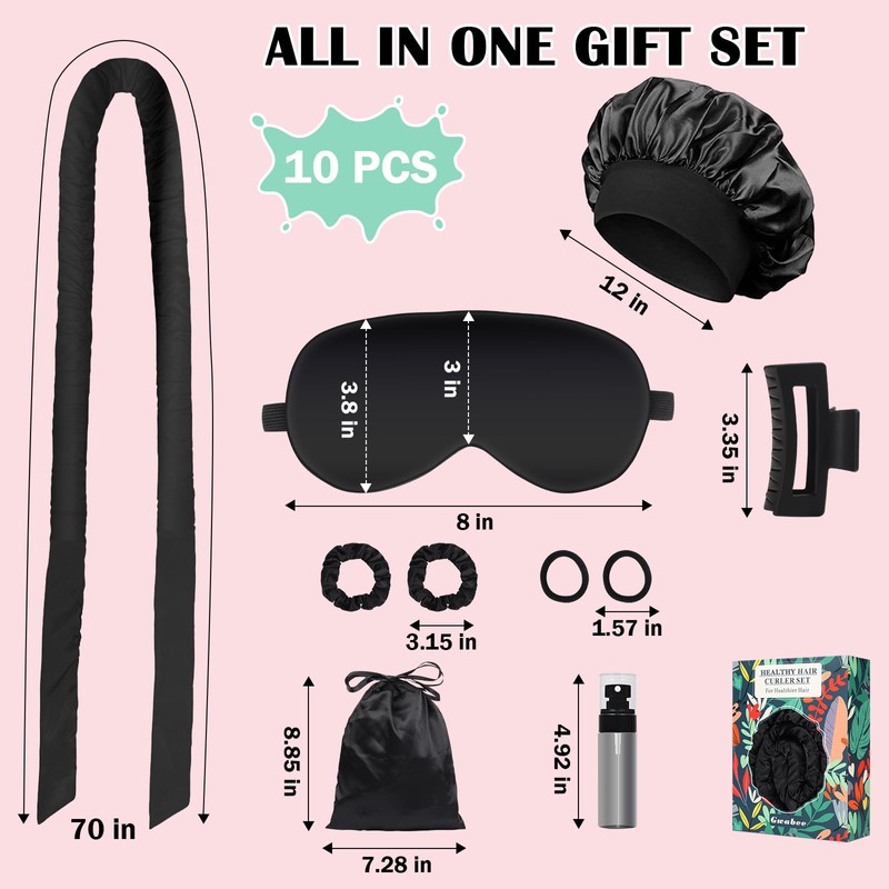- Un juego pensado para mujeres: nuestro juego de rizadores sin calor incluye 10 artículos: 1 diadema de satén de 70 pulgadas de largo, 1 gorro de satén para dormir, 1 antifaz de satén de seda para dormir, 1 pinza para el pelo, 2 gomas de pelo de satén, 2 gomas elásticas para el pelo, 1 bolsa de almacenamiento de satén y 1 botella con pulverizador.