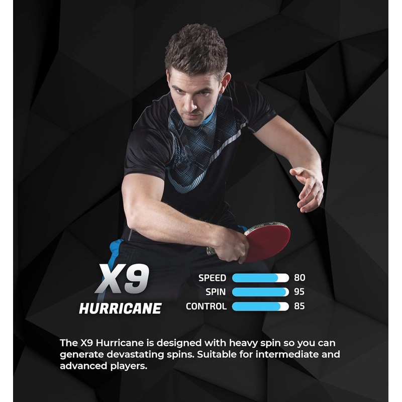 - DEVASTATING SPIN - The X9 Hurricane is designed with heavy spin on the rubber sheets so you can generate devastating sidespins and topspins! This is suitable for more advanced players or those about to take the next step.