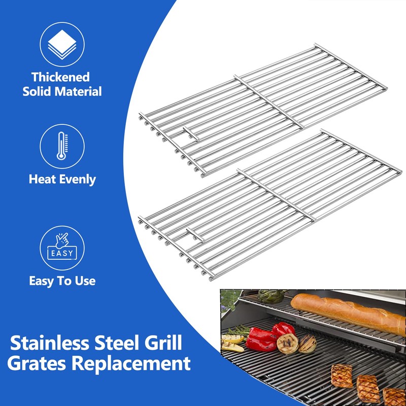 - 【Stainless Steel Grill Grates】 The rcs grill parts are made of 7mm stainless steel material and solid inner metal core material that heavier, sturdier and more durable than cast iron cooking grids, it is not as easy to break as cast iron grates and has strong construction. The best quality of rcs grill replacement grates have thick and heavy crossbars with narrow spaces in between, which will heat evenly and keep food away from falling, get more obvious grill marks.