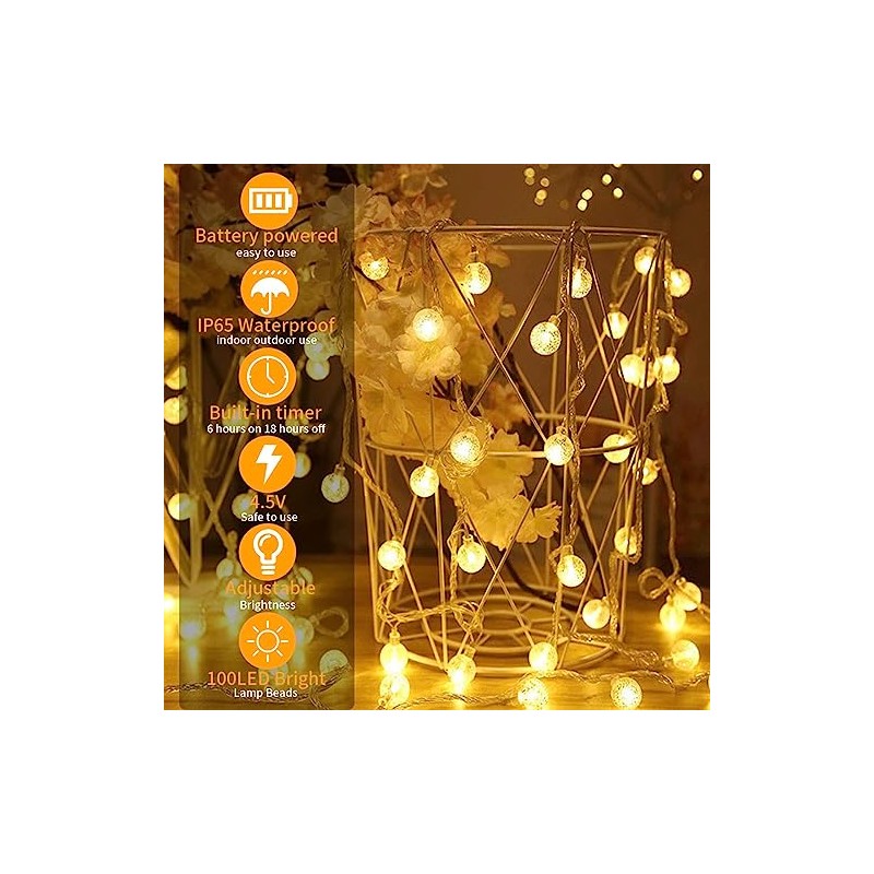 • ??2024 New Globe String Lights33ft 100LED fairy lights battery operated, 100LED is more transparent, 50% brighter than other ball lights.?The globe string lights 0.59 inch, 15mm bulb diameter, transparent tube, warm white lights and crystal ball style are more comfortable, containing crystal air bubbles, reflecting more beautiful light, everyone can enjoy a happy moment.