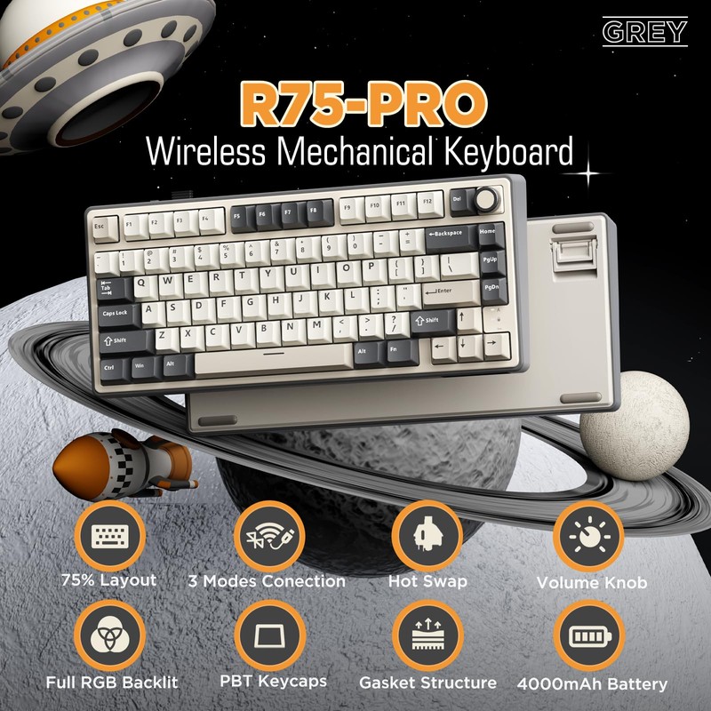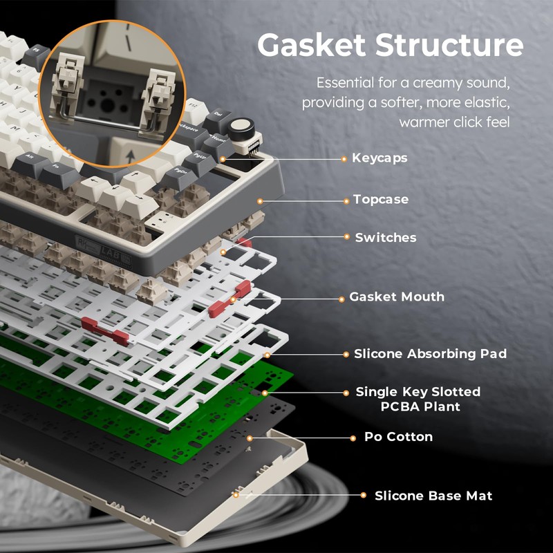 - 75% Gasket Mount Mechanical Keyboard Wireless: This 75% keyboard mechanical features a gasket structure incorporating five layers of sound-absorbing material. It adopts poron cotton for cushioning between the keyboard's PCB board and casing, effectively reduces key noise and vibration, optimize switch sound quality, and provide better typing experience, perfect for your daily work and gaming needs