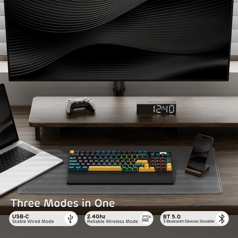• BT5.0/2.4G/USB-C - Believe it or not, this is the first generation of 3-mode wireless keyboard. Wireless mode with stable BT5.0, hassle-free 2.4Ghz dongle plus USB-C wired mode set no limits about your keyboard connection.