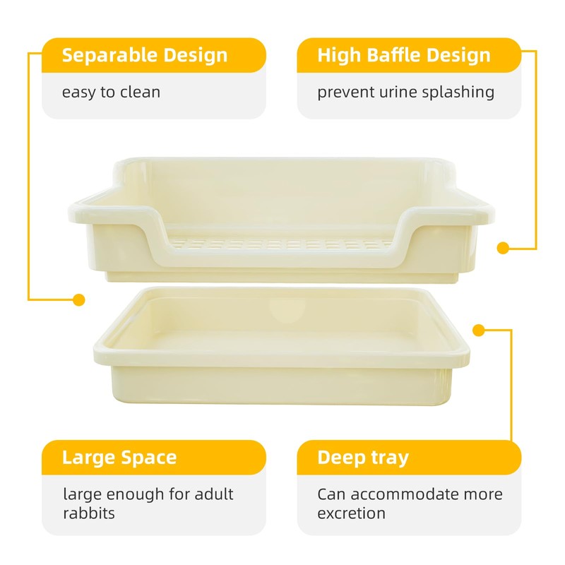 The clever design allows for easy cleaning, with detachable top and bottom sections. With three high sides, it effectively prevents urine splashes, ensuring a cleaner living environment. The thick plastic grid offers a comfortable surface for your rabbit's paws and allows for easy droppings removal.