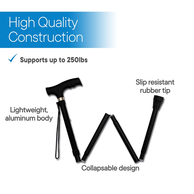 RMS Folding Cane - Foldable, Adjustable, Lightweight Aluminum Offset Walking Cane - Collapsible Walking Stick with Ergonomic Derby Handle - Ideal Daily Living Aid for Limited Mobility (Black)
