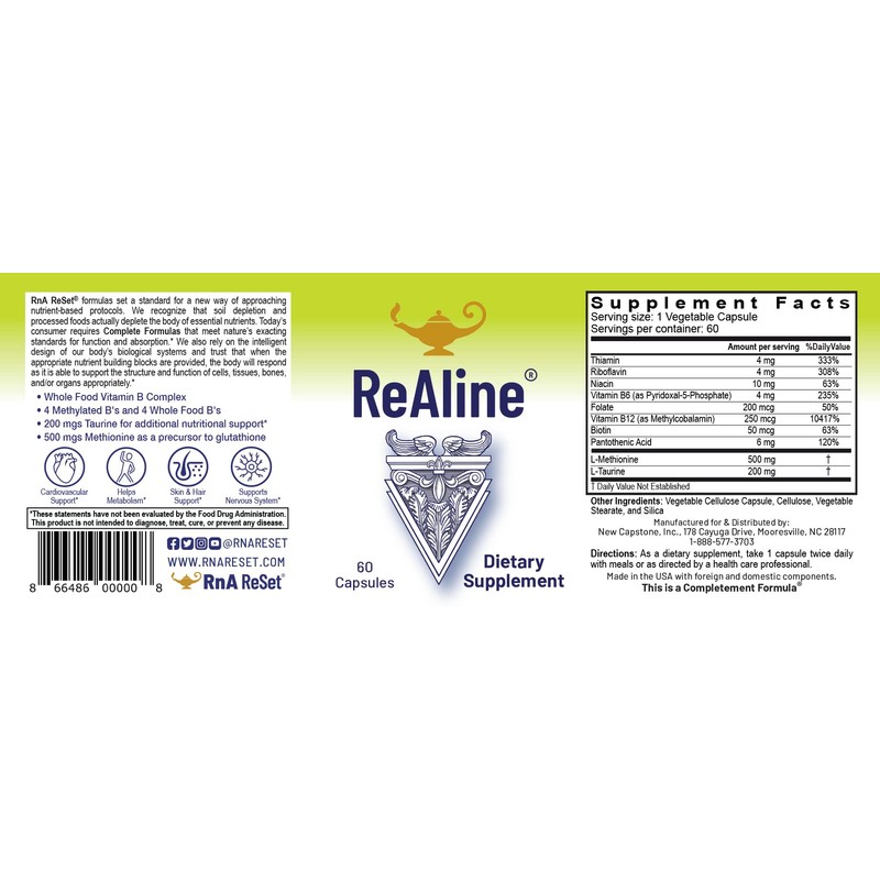 - ReAline Vitamin B complex supplement includes all eight B Vitamins, as well as L-Methionine and Taurine