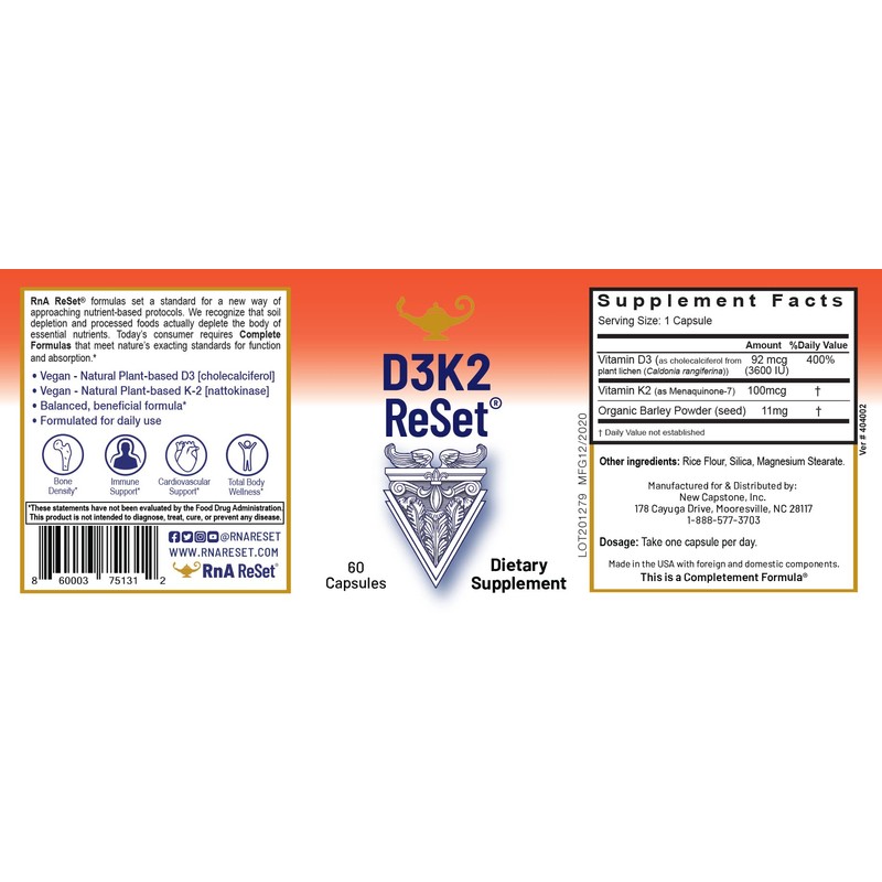- D3K2 ReSet contains 3,600IU of vitamin D3, 100mcg of Vitamin K2, and 11mg of RnA Powder