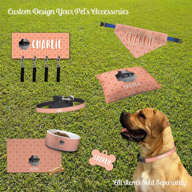Show your dog some love by designing and purchasing a special, personalized dog bandana! Your dog’s new bandana will be sure to make all of his/her canine friends jealous at the dog park. We print the front and back of these dog bandanas with your customized design. The bandana itself is made from a durable polyester, sewn together with a gap large enough to accommodate any collar. Regardless, the bandana includes a plain blue, canvas collar with plastic snaps, that can easily be removed if desired. These dog bandana collars are available in four sizes: small, medium, large, and extra large. Please see our sizing chart for more information regarding the dimensions of each size. We recommend that you wash your custom dog bandana in the washing machine, set to a gentle cycle, and alongside similar colors. As it is made from polyester, it can be dried in a dryer, or left to air dry if you prefer. Design Shown: Red & Gray Dots and Plaid (#193551) Features: ==================================== * Bandana made from durable polyester * Design(s) printed on both sides * Large gap that allows for easy removal from collar * Blue, canvas collar included with plastic snaps * 4 sizes available: small, medium, large, and extra large * Machine washable on gentle cycle and with like colors * Completely customizable * Made for you in the USA Care Instructions: ==================================== * Wash in washing machine, on gentle cycle and with like colors * Can be placed in a dryer or left to air dry