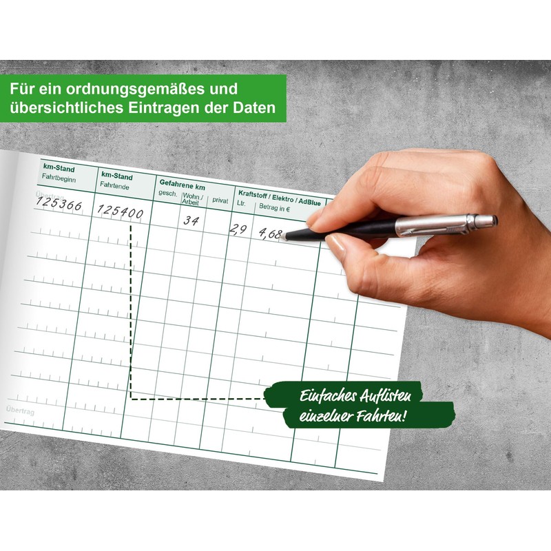 - The high-quality logbook is legally secure and contains important notes and tips for filling in. All journeys can be distinguished between business and private journeys