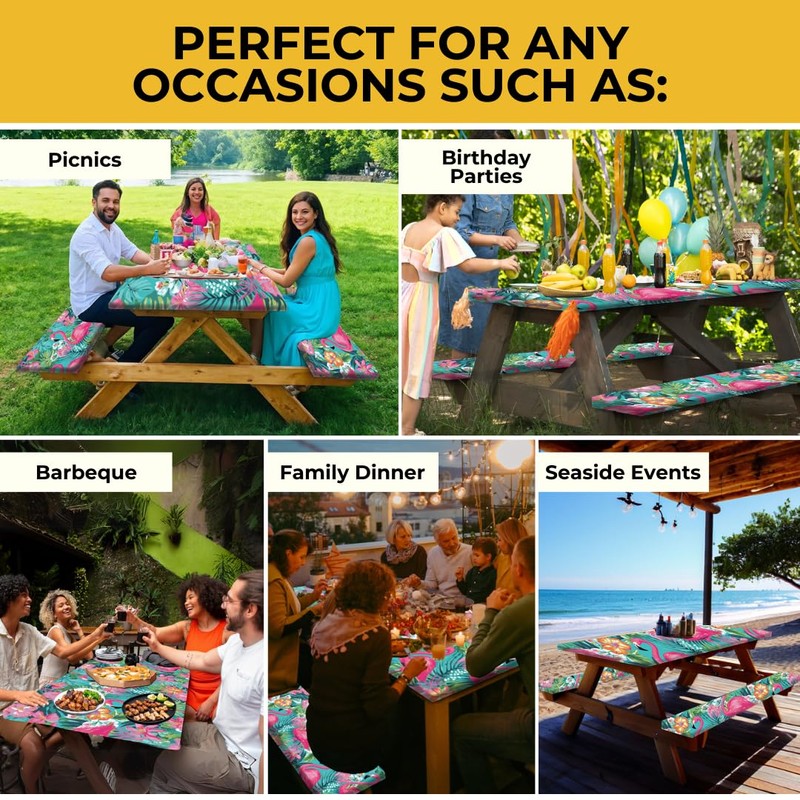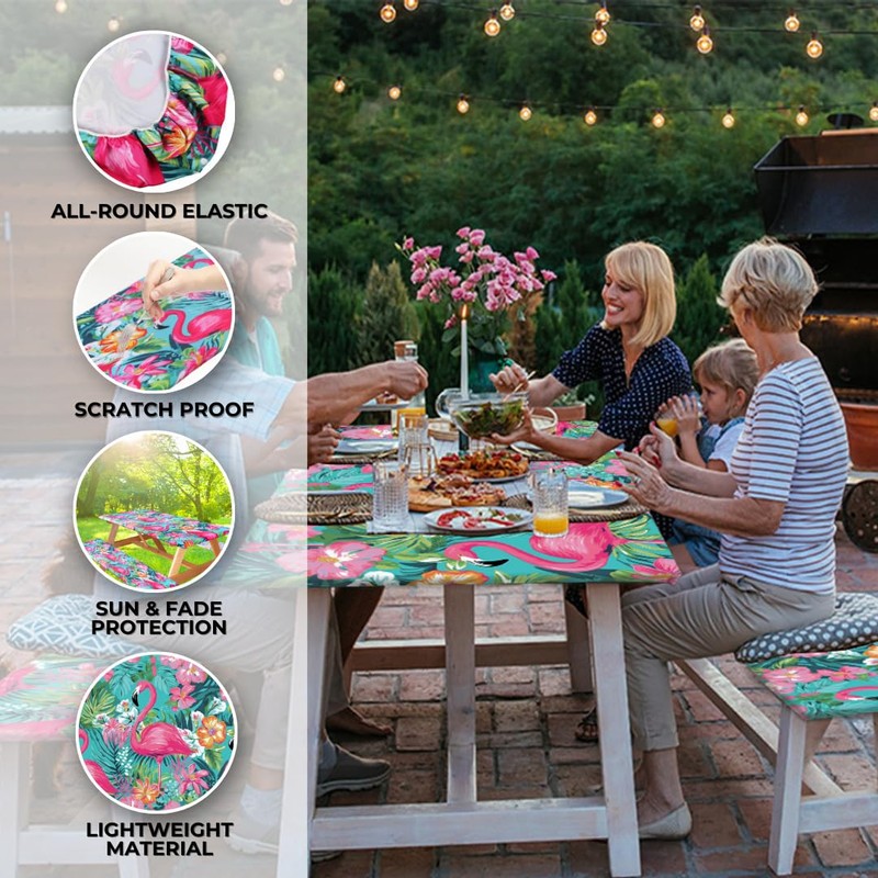 - WRINKLE FREE & WASHABLEFitted picnic table cover with bench covers is designed with all round elastic bands to make the polyester tablecloth fit tightly. The outdoor rectangle fitted table cloth is reusable, could easy wipe out stains by sponge. It is better to wash by hand, do not do bleach or iron