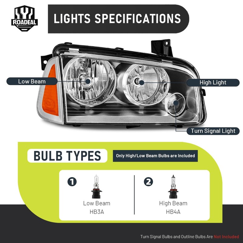 - 【Perfect OE Fitment】OEM#4806165AJ/AC/AF/4806164AJ/AC/AF4806219AD/4806218AD.Partslink#CH2502163/CH2503163/CH2502206/CH2503206/CH2550124/CH2551126.Headlights assembly 100% perfect fitment for OE type 2006-2010 Dodge Charger with Corner Singal Lights; Low/High Beam: HB4A/HB3A(bulbs included), Turn Signal Light:3157 (bulbs not included); As an ISO-certified manufacturer, we only provide top quality products with DOT and SAE certifications.
