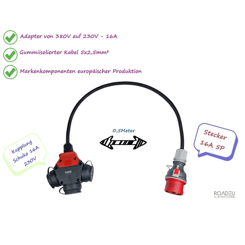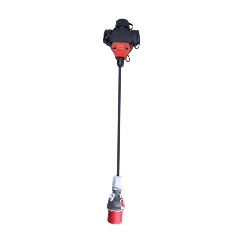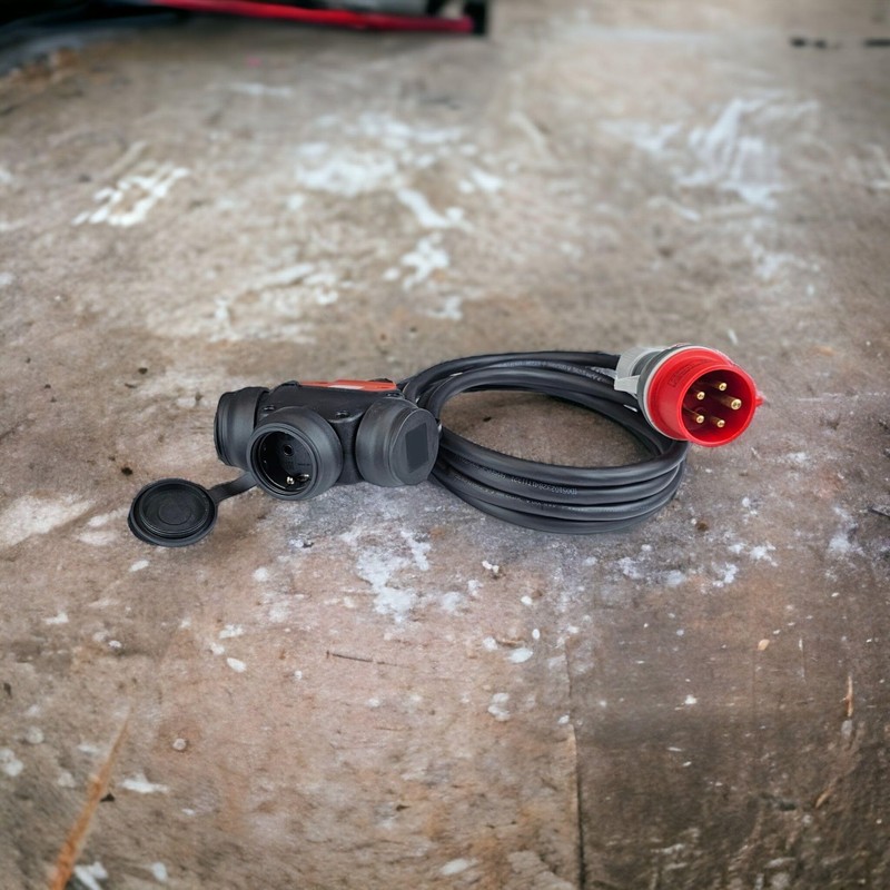 - CEE adapter – technical data: 400 V 16 A 5 pin CEE plug, 3 x 230 V Schuko socket coupling. Each 230V socket is connected to a separate phase.