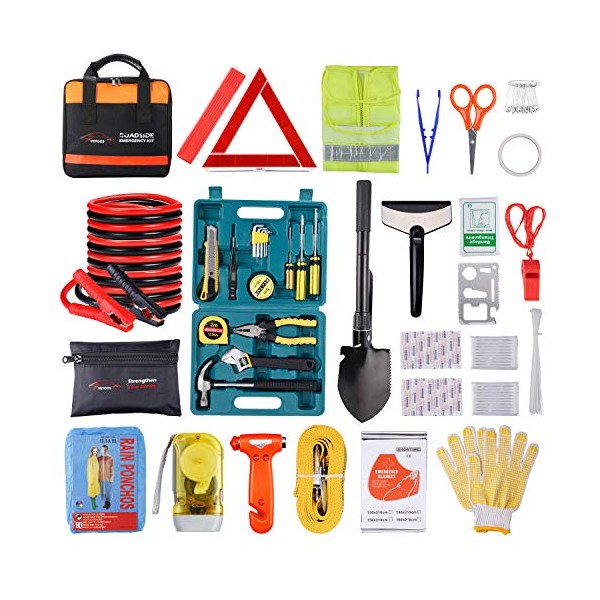 - 【ESSENTIAL RESOURCES】This car emergency kit contains most practical supplies, like jumper cables, reflective triangle and vest, a tow rope, a hand-driven flashlight, and a tire pressure gauge. It also includes rarely used but necessary items: a safety hammer, an emergency blanket, a survival whistle, and 47PCS first aid kit. These items will maximize your safety during a breakdown or an accident.
