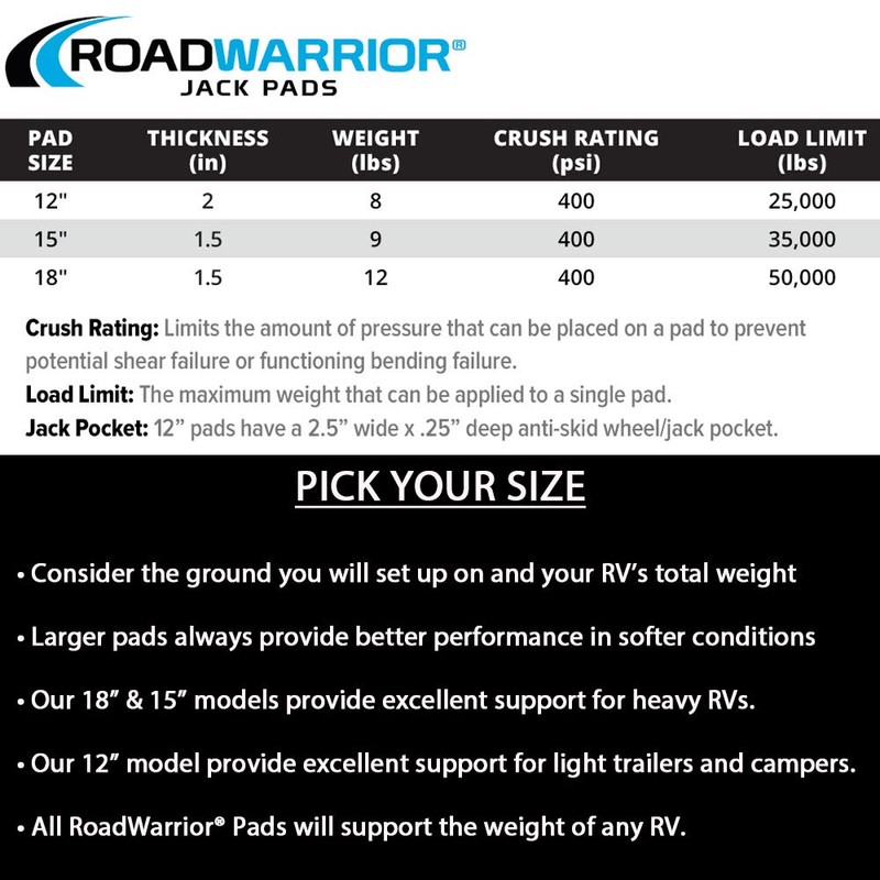 - RoadWarrior Jack Pads are engineered for unbeatable strength to keep your camper, RV or trailer safe and level. They easily support RV Jacks from sinking into soft ground or damaging paved surfaces.
