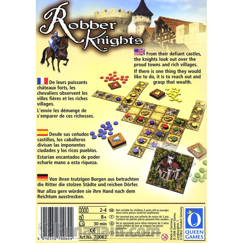 The knights set off from their castles to conquer the surrounding land. For the wealth of the big towns and the villages belonging to them is just too tempting. Of course, once in possession, no knight wants to lose his newly acquired properties, so this means: caution. For the other players knights are awake to any opportunity and the newly gained land may be lost again just as quickly to a new lord. Bring your landscape tiles and above all your knights skillfully into play, secure your properties on all sides and watch out for enemy knights at all times.