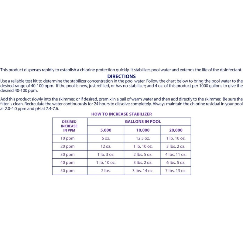 - 6 ounces raises cyanuric acid level 10 ppm per 5,000 gallons of water