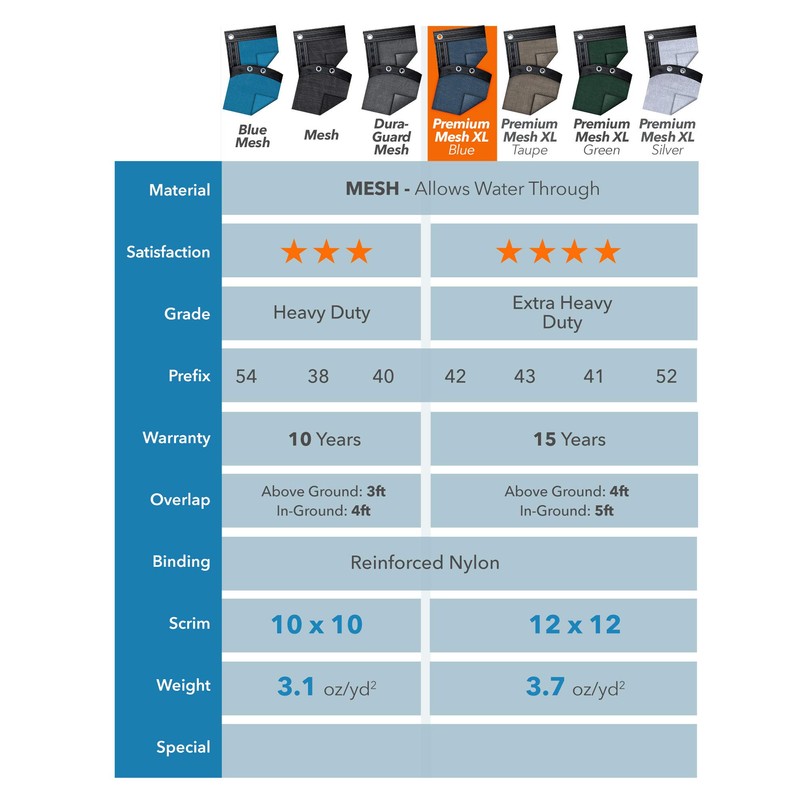 The Robelle Blue Premium Mesh XL Winter Pool Cover is an extra heavy-duty mesh winter pool cover. Mesh pool covers allow water to pass through their material. This is an extra heavy-duty pool cover designed to protect your pool from the winter elements. Customers buy mesh pool covers because they require less maintenance than solid pool covers during the winter months. Mesh pool covers are also good for high wind situations as the material sits in the pool water. Pool owners that use a mesh pool cover typically will have additional work cleaning their pool in the spring before opening. The Robelle Blue Premium Mesh XL Winter Pool Cover features blue and black woven colors. Please order by your pool size, as the overlap goes beyond the pool size listed. This cover includes a four-foot overlap. If you have a very large top rail, please consider a larger pool size. This cover should be able to comfortably float in the pool water without excessive stress. This cover is not meant to be used as a debris cover during the swimming season. This winter pool cover is intended to be used during the off-season. This cover is meant for traditional above ground pools with a traditional top rail. Includes a winch and cable that should be used to secure your pool cover through the grommets around the perimeter of the pool cover. For extra securing, cover clips and cover wrap (both sold separately) are suggested for pool closing. No other method of installation is recommended..
