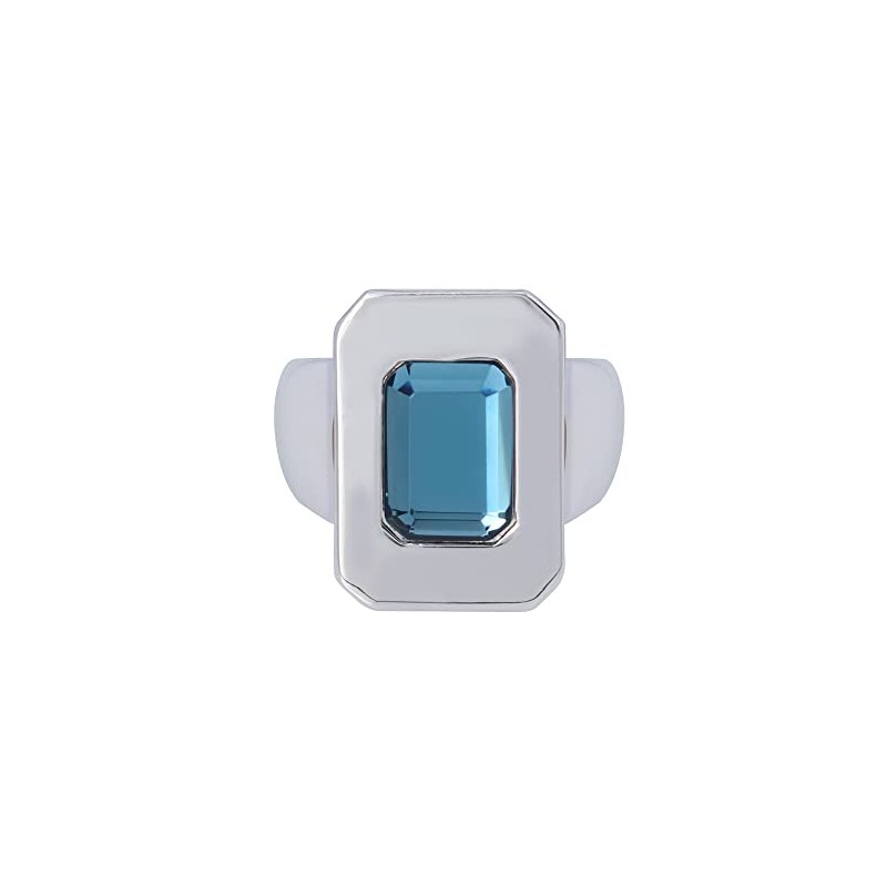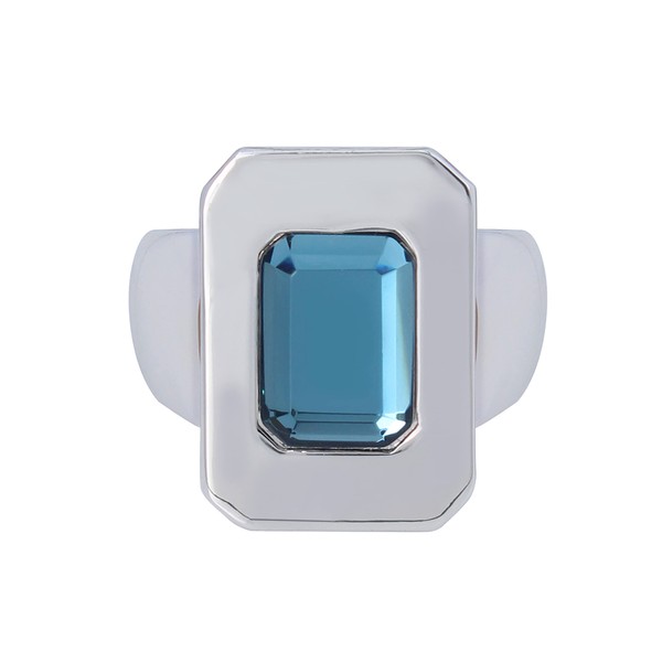 - Geometric cocktail ring featuring dreamy blue rectangle stone. Earrings have a post back closure. Ring is size 7.5. Made from polished metal and epoxy.