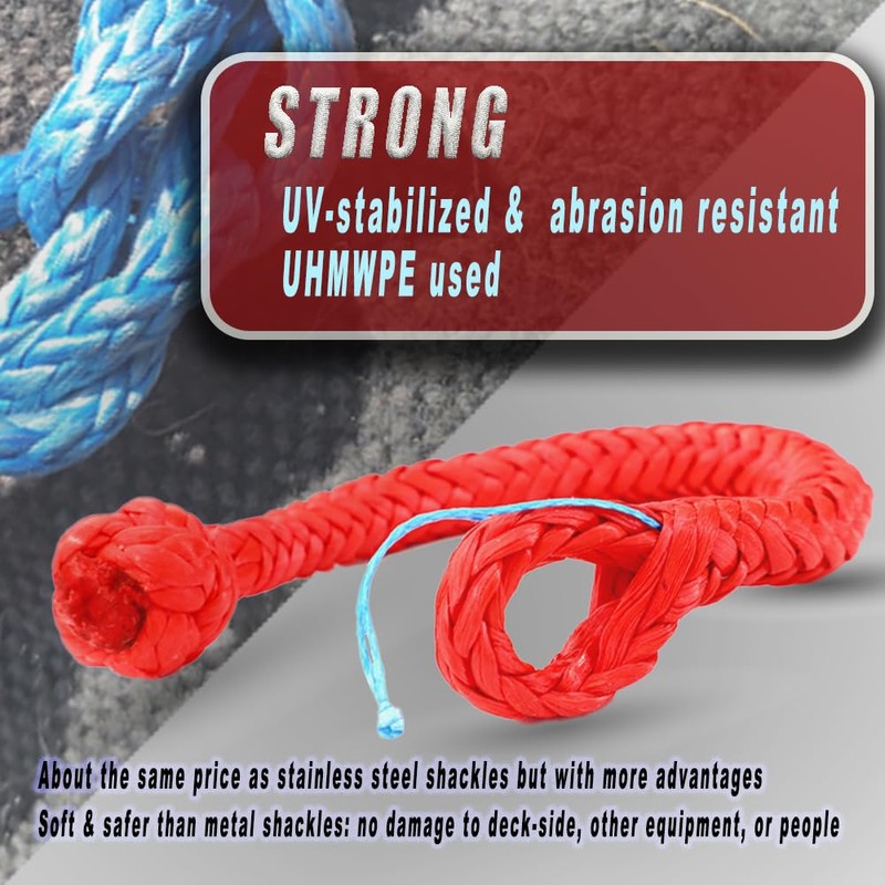 - STRONG - Constructed from ultra-high molecular weight polyethylene (UHMWPE) fiber, our soft shackles are exceptionally strong, UV stabilized, and abrasion resistant.