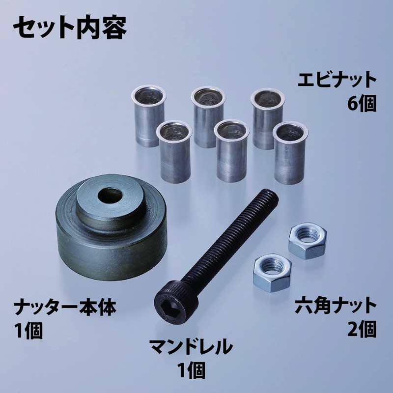 - Contents: 1 mandrel, 2 hex nuts, 6 shrimp nuts, 1 nut