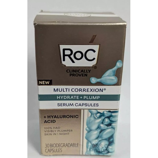 Discover RoC clinically proven Hydrate + Plump Serum Capsules, with our fastest-acting Hyaluronic Acid. In just 1 night, 100% of women had visibly plumper skin. After 1 week, 100% had visibly reduced lines & wrinkles & a 2X boost in skinâs hydration levels. These capsules contain a perfectly measured dose of Hyaluronic Acid, proven to draw moisture from within skin up to the surface for maximum plumping power. Our 100% biodegradable capsules are sealed tight for optimal freshness & easy on-the-go use.