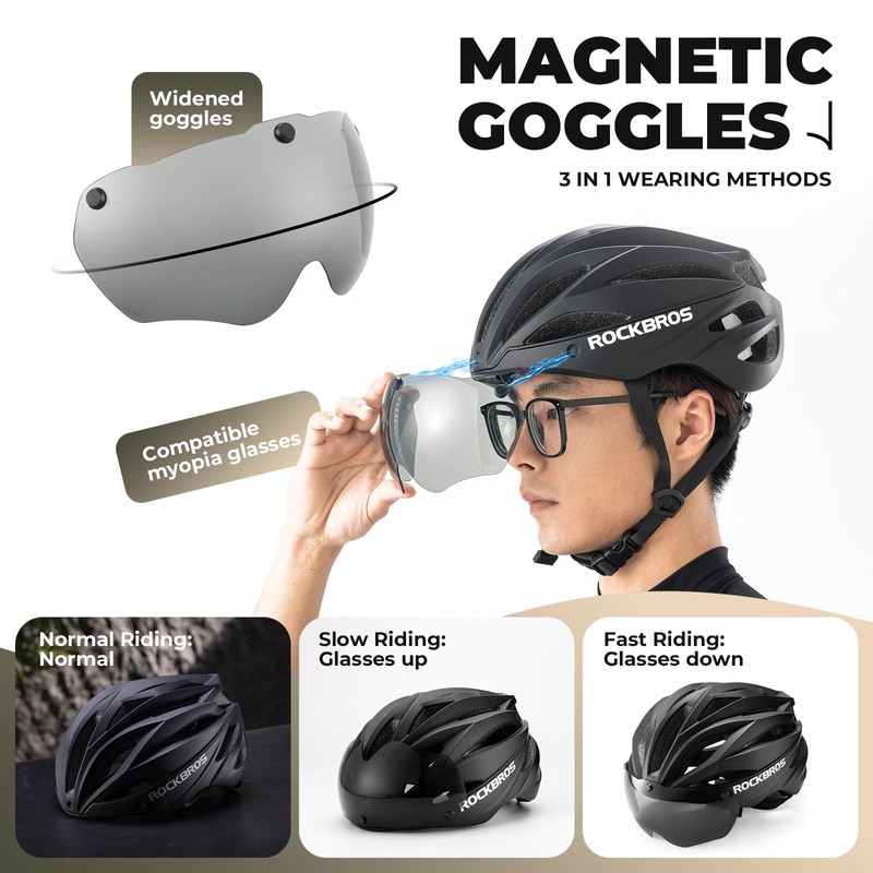 - Magnetic Multi Mode Glasses The helmets are equipped with magnetic goggles, which can be adjusted to three modes: fast mode, slow mode and leisure mode. Each mode allows the glasses to be adjusted to the needs of the rider