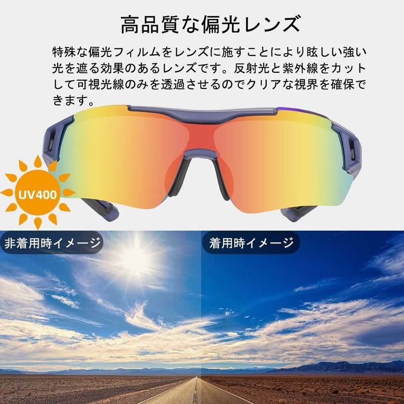 - 【優れた靭性】偏向サングラスのテンプルはPC素材で、弾性・安定性・耐衝撃性・靭性が強く、締め付け感がなくどんな顔の形でもフィットします。空気抵抗を軽減する曲線設計が使用され、走行中ストレスなく快適なサイクリングを楽しみます。
