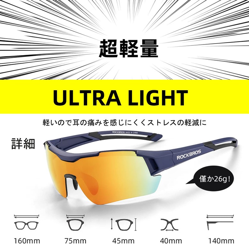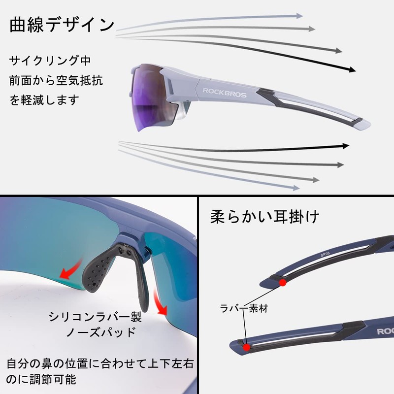 - 【調整可能の鼻当て】柔らかいシリコンラバー製のノーズパッドは自在に動かませ、自分の鼻の位置に合わせて上下左右調節し、しっかりフィットします。スポーツサングラスの耳掛けの部分は柔軟性のあるラバー素材で可動します。耳にかけても硬いPC素材より痛くなりにくく、長時間の着用に役立つデザインです。超軽量!僅か26g、使用しているのを忘れます!度付きレンズを装着できるインナーフレームが付き、近視者に楽に利用できます。(度付きレンズの装着はお近くの眼鏡店へご相談ください)